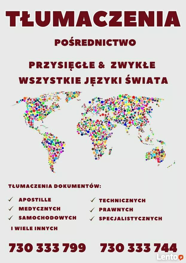 Oferujemy usługę pośrednictwa w tłumaczeniach dokumentów przysięgłych oraz zwykłych we wszystkich językach świata.Tłumaczenia dokumentów: apostille, medyczne, samochodowe, specjalistyczne, prawne, techniczne i wiele innych.